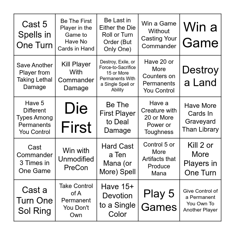 This bingo card has a free space and 32 words: Play 5 Games, Have 12 Lands in Play, Die First, Discard 1 or More Cards During Cleanup, Cast Commander 3 Times in One Game, Kill Player With Commander Damage, Win a Game, Kill 2 or More Players in One Turn, Be The First Player in the Game to Have No Cards in Hand, Attack 3 Different Players in One Turn, Destroy, Exile, or Force-to-Sacrifice 15 or More Permanents With a Single Spell or Ability, Be Last in Either the Die Roll or Turn Order (But Only One), Have 60 or More Life, Have 20+ Creatures, Have a Creature with 20 or More Power or Toughness, Win or Lose a Game on a Condition Other than Life Loss or Commander Damage, Cast a Turn One Sol Ring, Have 5 Different Types Among Permanents You Control, Hard Cast a Ten Mana (or More) Spell, Win with Unmodified PreCon, Control 5 or More Artifacts that Produce Mana, Draw 10 or More Cards in One Turn, Have More Cards In Graveyard Than Library, Take Control of A Permanent You Don't Own, Give Control of a Permanent You Own To Another Player, Win a Game Without Casting Your Commander, Have 20 or More Counters on Permanents You Control, Save Another Player from Taking Lethal Damage, Cast 5 Spells in One Turn, Have 15+ Devotion to a Single Color, Deal Lethal Damage To Yourself and Destroy a Land.