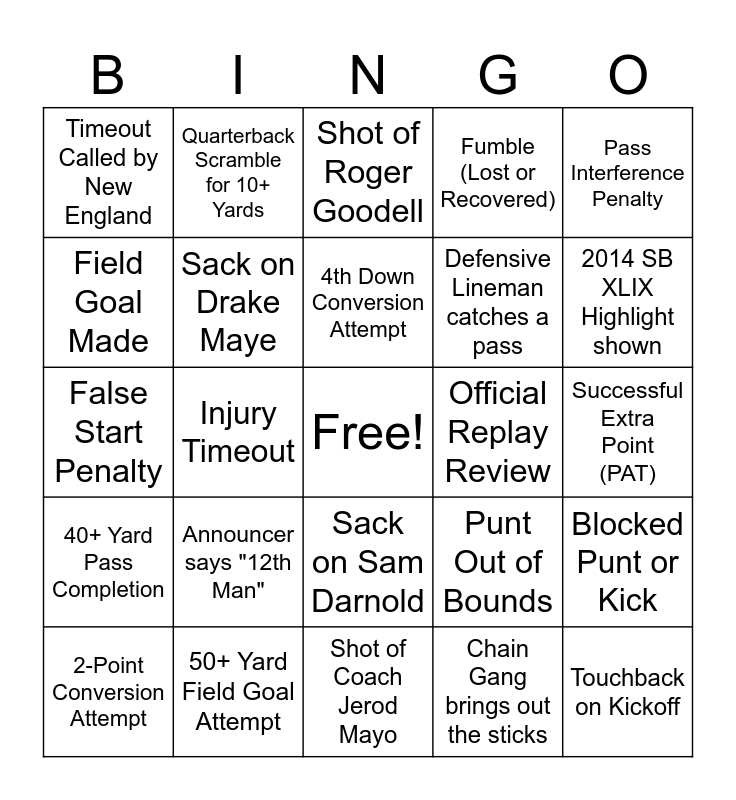 This bingo card has a free space and 35 words: Passing Touchdown, Rushing Touchdown, Interception, Sack on Drake Maye, Sack on Sam Darnold, Fumble (Lost or Recovered), Field Goal Made, Missed Field Goal or PAT, 4th Down Conversion Attempt, Offensive Holding Penalty, False Start Penalty, Pass Interference Penalty, Unsportsmanlike Conduct Flag, Timeout Called by Seattle, Timeout Called by New England, Official Replay Review, Chain Gang brings out the sticks, Injury Timeout, 40+ Yard Pass Completion, Touchback on Kickoff, Punt Out of Bounds, 2-Point Conversion Attempt, Blocked Punt or Kick, 50+ Yard Field Goal Attempt, Shot of Roger Goodell, 2014 SB XLIX Highlight shown, "Levi's Stadium" text on screen, Shot of a Celebrity in a suite, Defensive Lineman catches a pass, Successful Extra Point (PAT), Shot of Coach Mike Macdonald, Shot of Coach Jerod Mayo, Announcer says "12th Man", Quarterback Scramble for 10+ Yards and Delay of Game Penalty.