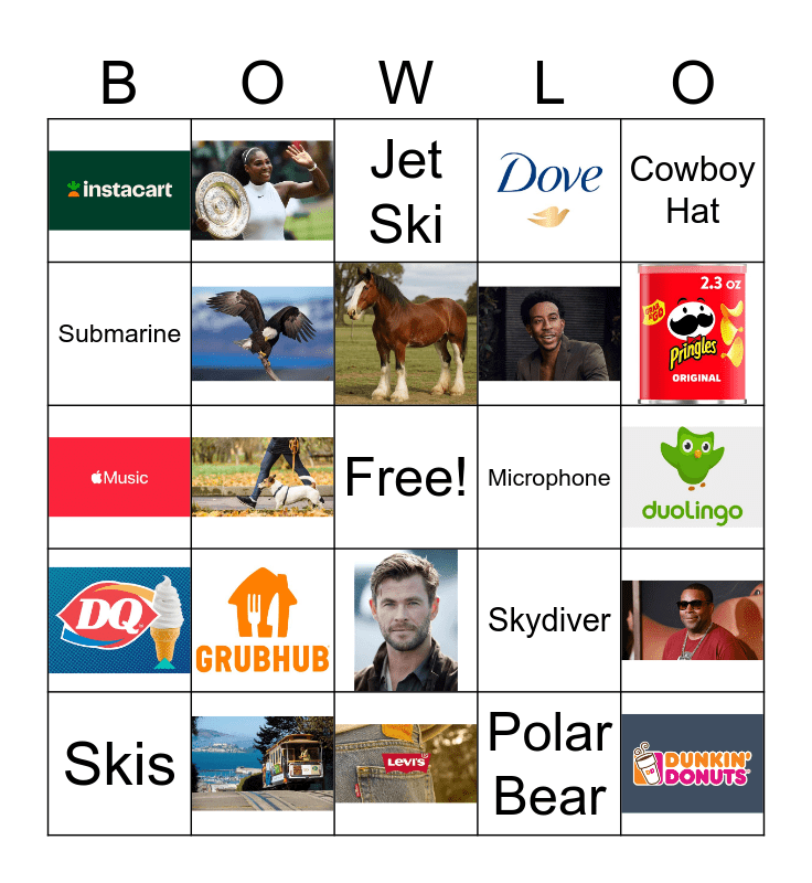 This bingo card has 28 images, a free space and 13 words: Astronaut, Cowboy Hat, Microphone, Jet Ski, Pickup Truck, Polar Bear, Potato, Refrigerator, Skis, Skydiver, Submarine, Swimming Pool and Talking Animal.
