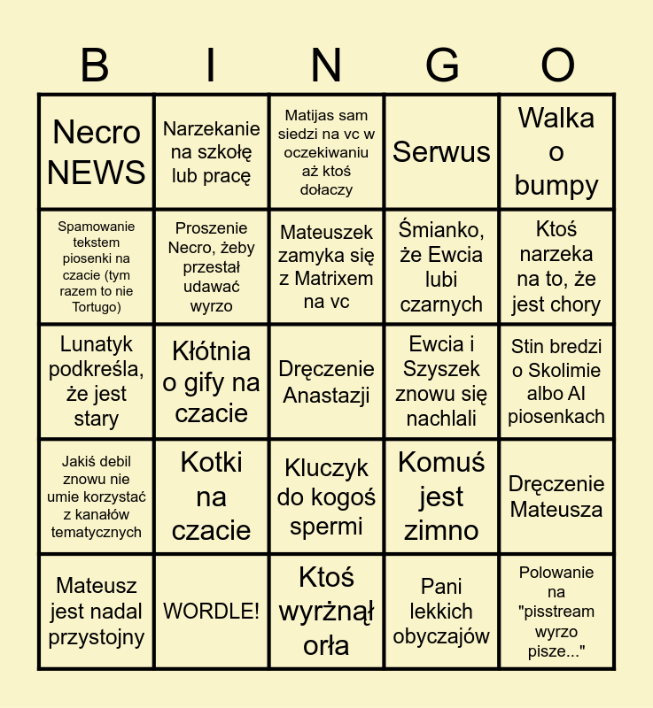 This bingo card has 25 words: Jakiś debil znowu nie umie korzystać z kanałów tematycznych, WORDLE!, Dręczenie Anastazji, Pani lekkich obyczajów, Walka o bumpy, Necro NEWS, Narzekanie na szkołę lub pracę, Matijas sam siedzi na vc w oczekiwaniu aż ktoś dołaczy, Ewcia i Szyszek znowu się nachlali, Dręczenie Mateusza, Spamowanie tekstem piosenki na czacie (tym razem to nie Tortugo), Proszenie Necro, żeby przestał udawać wyrzo, Ktoś wyrżnął orła, Komuś jest zimno, Ktoś narzeka na to, że jest chory, Mateusz jest nadal przystojny, Kłótnia o gify na czacie, Mateuszek zamyka się z Matrixem na vc, Śmianko, że Ewcia lubi czarnych, Stin bredzi o Skolimie albo AI piosenkach, Lunatyk podkreśla, że jest stary, Kotki na czacie, Kluczyk do kogoś spermi, Serwus and Polowanie na "pisstream wyrzo pisze...".