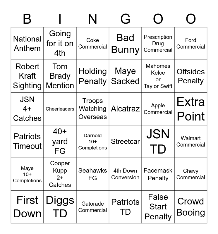 This bingo card has 79 words: Pass Interference, Fair Catch, Coke Commercial, 21+ combined points, Pepsi Commercial, Fireworks, False Start Penalty, Seahawks Timeout, Patriots TD, Patriots FG, Seahawks FG, American Flag, Bad Bunny, National Anthem, Pizza Commercial, Ford Commercial, Chevy Commercial, Apple Commercial, Fan Face Paint, Troops Watching Overseas, Gatorade Commercial, Prescription Drug Commercial, Mahomes Kelce or Taylor Swift, Tom Brady Mention, Robert Kraft Sighting, Dynasty Mention, Heads, Tails, 20+ yard pass, 15+ yard run, Maye Sacked, Darnold Sacked, JSN TD, Maye 10+ Completions, Darnold 10+ Completions, Cheerleaders, Jeep Commercial, Kenneth Walker TD, Diggs TD, JSN 4+ Catches, Cooper Kupp 2+ Catches, Amazon Commercial, Tight End TD, One Handed Catch, First Down, Going for it on 4th, 4th Down Conversion, Facemask Penalty, Roughing the Passer, Seahawks TD, 40+ yard FG, Offsides Penalty, Patriots Timeout, Doritos Commercial, Celeb in stands, Budweiser Commercial, Crowd Booing, 2pt Conversion, Running Back TD, Extra Point, Holding Penalty, Interception, Toyota Commercial, Coaches Challange, Fumble, WR TD, 15+ combined points, Mike Vrabel TD Mention, Golden Gate Bridge, Alcatraz, Streetcar, Pacific Ocean, Maye Rushing for First Down, Patriots 10+ Points, Seahawks 10+ Points, Walmart Commercial, Movie Trailer Commercial, Shot of Trophy and Patriots comeback vs Atlanta.