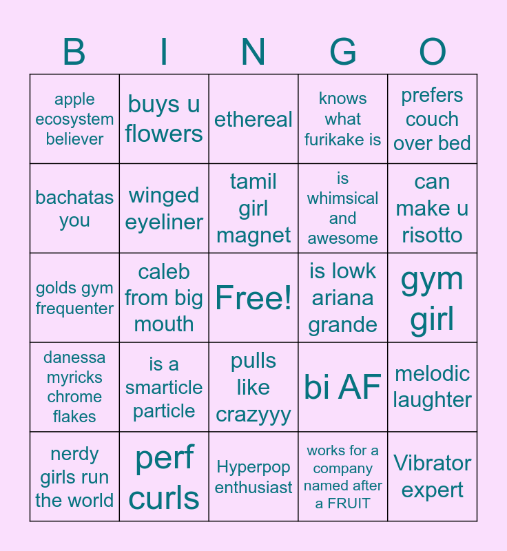 This bingo card has a free space and 24 words: is a smarticle particle, perf curls, tamil girl magnet, nerdy girls run the world, prefers couch over bed, apple ecosystem believer, bachatas you, buys u flowers, is lowk ariana grande, pulls like crazyyy, is whimsical and awesome, golds gym frequenter, bi AF, melodic laughter, winged eyeliner, works for a company named after a FRUIT, gym girl, ethereal, can make u risotto, caleb from big mouth, Vibrator expert, danessa myricks chrome flakes, knows what furikake is and Hyperpop enthusiast.