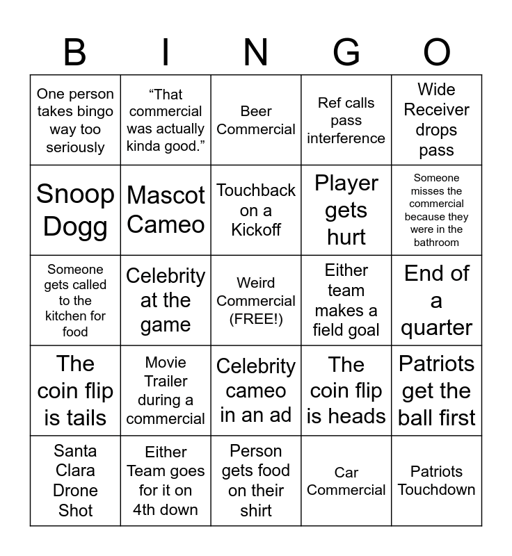 This bingo card has a free space and 44 words: Seahawks Touchdown, Patriots Touchdown, Coach yells at ref, Santa Clara Drone Shot, Player cries during national anthem, Car Commercial, Beer Commercial, TV Broadcaster says something stupid, Wide Receiver drops pass, Either Team goes for it on 4th down, Ref calls pass interference, Either team makes a field goal, Celebrity cameo in an ad, Movie Trailer during a commercial, Someone mentions a non-sports topic during the game, Person gets food on their shirt, Someone mentions how the Colts or Steelers would never get to the Super Bowl, Someone gets called to the kitchen for food, Commercial with a song that slaps for no reason, Someone misses the commercial because they were in the bathroom, “That commercial was actually kinda good.”, Camera zooms in on a cheering fan, Person who doesn’t care about football suddenly VERY invested, One person takes bingo way too seriously, Two minute warning, End of a quarter, Sack, Tight end catches a pass, The coin flip is heads, The coin flip is tails, Seahawks get the ball first, Patriots get the ball first, Dog commercial, “Brought to you by…”, Celebrity at the game, "oh he touched it down", "great fumble", Uber Eats commercial, Touchback on a Kickoff, Snoop Dogg, Player gets hurt, Camera zooms in on a disappointed fan, Mascot Cameo and Cheerleader Cameo.