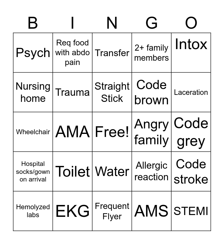 This bingo card has a free space and 24 words: Toilet, EKG, Straight Stick, Hemolyzed labs, Intox, Psych, Nursing home, Req food with abdo pain, Angry family, Water, Code brown, Wheelchair, Allergic reaction, Code stroke, Trauma, AMS, Code grey, Transfer, Laceration, AMA, STEMI, Hospital socks/gown on arrival, 2+ family members and Frequent Flyer.