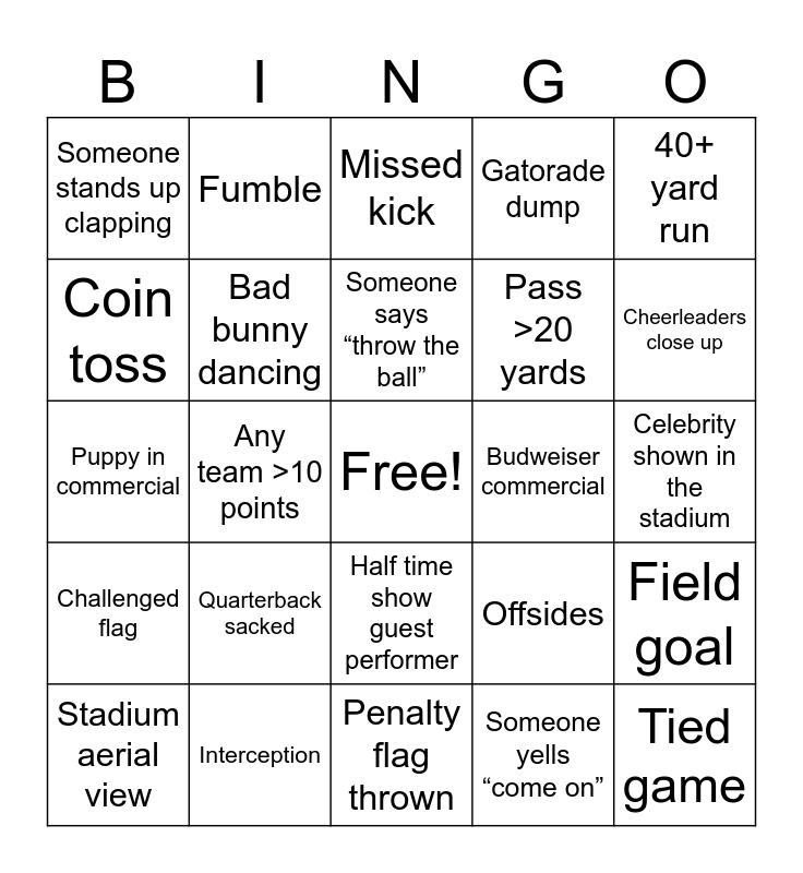 This bingo card has a free space and 30 words: Interception, Touchdown dance, Any team >10 points, Any team >20 points, Someone stands up clapping, Missed kick, Bad bunny dancing, Half time show guest performer, Budweiser commercial, Penalty flag thrown, Celebrity shown in the stadium, Tied game, Someone yells “come on”, Pepsi commercial, Cheerleaders close up, First touchdown, Offsides, Challenged flag, Quarterback sacked, 40+ yard run, Puppy in commercial, Time out, Fumble, Pass >20 yards, Coin toss, Gatorade dump, Field goal, Stadium aerial view, Someone says “throw the ball” and Total points scored >40.