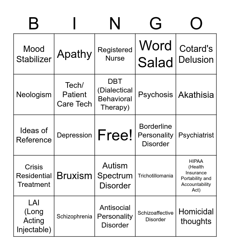 This bingo card has a free space and 30 words: Schizophrenia, Anxiety, Depression, Phobia, Mood Stabilizer, Registered Nurse, Tech/ Patient Care Tech, Autism Spectrum Disorder, Borderline Personality Disorder, Antisocial Personality Disorder, Psychiatrist, Homicidal thoughts, Schizoaffective Disorder, Bipolar Disorder, Akathisia, Labile, Trichotillomania, Crisis Residential Treatment, Bruxism, Cotard's Delusion, Ideas of Reference, EPS (Extrapyramidal Symptoms), Apathy, Psychosis, Neologism, Word Salad, HIPAA (Health Insurance Portability and Accountability Act), LAI (Long Acting Injectable), DBT (Dialectical Behavioral Therapy) and CBT (Cognitive Behavioral Therapy).