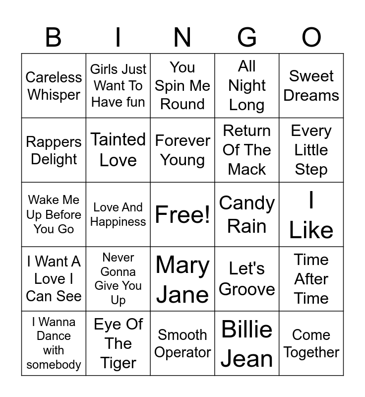 This bingo card has a free space and 24 words: I Wanna Dance with somebody, Never Gonna Give You Up, Forever Young, Billie Jean, Sweet Dreams, Careless Whisper, Girls Just Want To Have fun, You Spin Me Round, Candy Rain, I Like, Wake Me Up Before You Go, Tainted Love, Let's Groove, Time After Time, Rappers Delight, Eye Of The Tiger, Smooth Operator, All Night Long, Every Little Step, I Want A Love I Can See, Love And Happiness, Mary Jane, Return Of The Mack and Come Together.