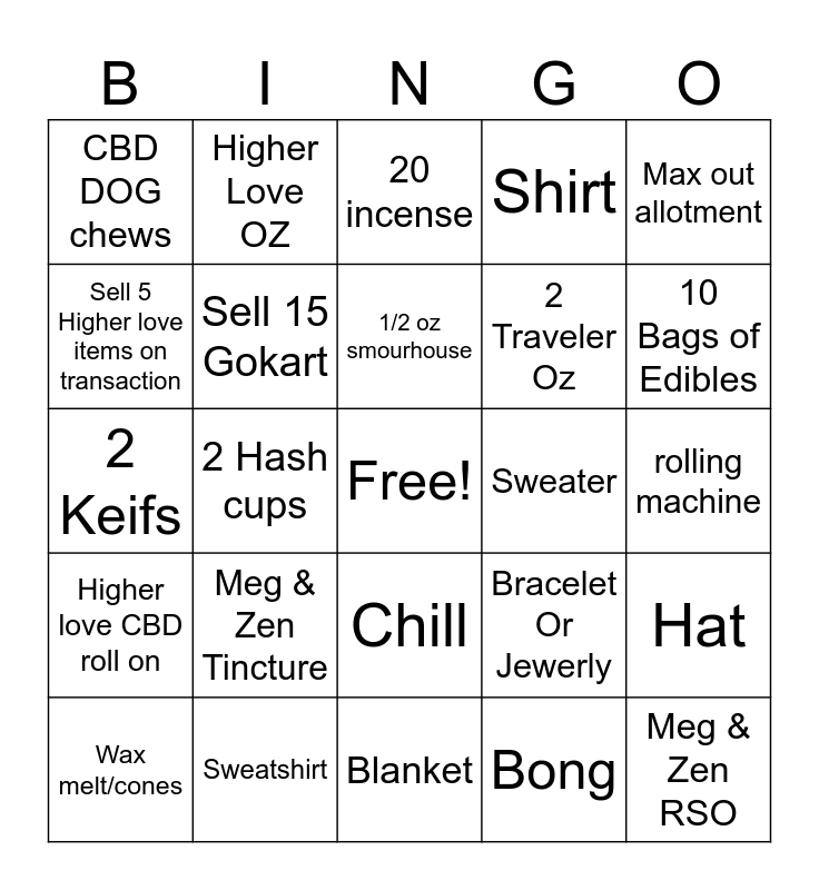 This bingo card has a free space and 24 words: Meg & Zen Tincture, Sweatshirt, 1/2 oz smourhouse, Wax melt/cones, Max out allotment, CBD DOG chews, Sell 5 Higher love items on transaction, Higher Love OZ, Sweater, Chill, 2 Traveler Oz, 2 Keifs, Bracelet Or Jewerly, Hat, Sell 15 Gokart, Bong, rolling machine, 20 incense, 10 Bags of Edibles, 2 Hash cups, Meg & Zen RSO, Higher love CBD roll on, Shirt and Blanket.