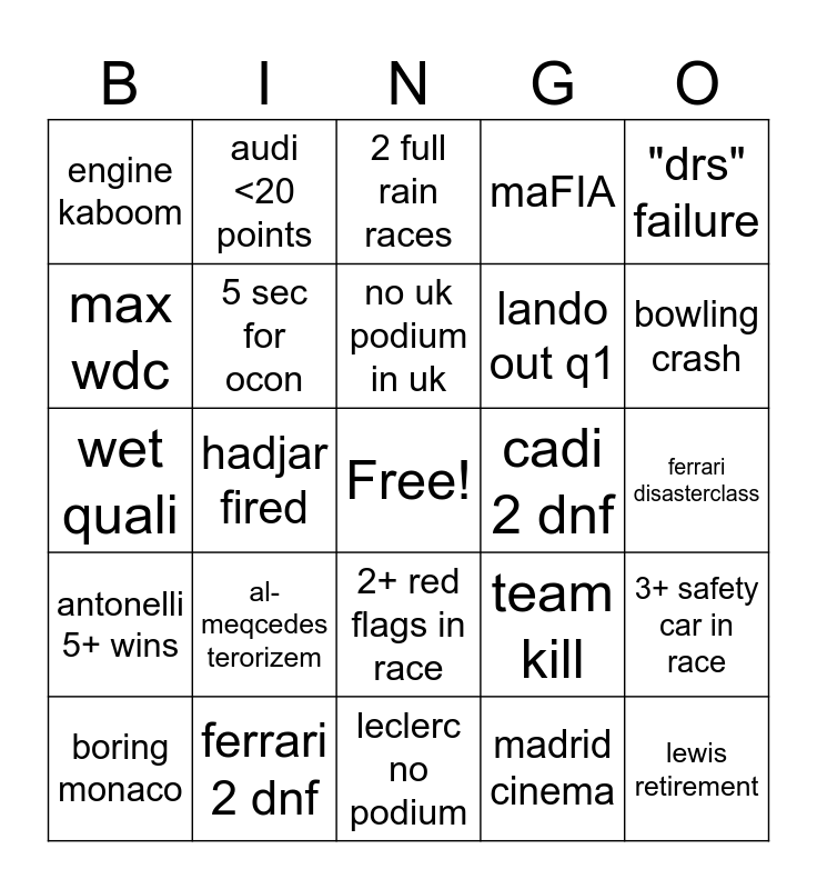 This bingo card has a free space and 24 words: al-meqcedes terorizem, ferrari 2 dnf, no uk podium in uk, boring monaco, "drs" failure, engine kaboom, max wdc, audi <20 points, cadi 2 dnf, 2+ red flags in race, lando out q1, wet quali, team kill, 3+ safety car in race, 5 sec for ocon, madrid cinema, ferrari disasterclass, 2 full rain races, bowling crash, hadjar fired, lewis retirement, antonelli 5+ wins, maFIA and leclerc no podium.