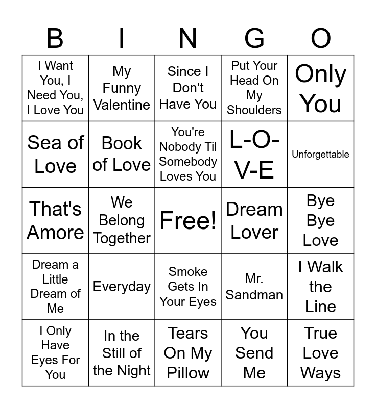 This bingo card has a free space and 43 words: Can't Help Falling In Love, True Love Ways, Earth Angel, I Only Have Eyes For You, Love Me Tender, You Send Me, Since I Don't Have You, All I Have to Do Is Dream, Only You, In the Still of the Night, Put Your Head On My Shoulders, Dream Lover, Smoke Gets In Your Eyes, Everyday, Chances Are, Tears On My Pillow, Why Do Fools Fall In Love?, That's Amore, I've Got You Under My Skin, Unforgettable, My Funny Valentine, Devoted to You, Words of Love, I Want You, I Need You, I Love You, You Are My Special Angel, Bye Bye Love, Cheek to Cheek, Misty, Mr. Sandman, Dream a Little Dream of Me, Stupid Cupid, I Walk the Line, Fever, We Belong Together, Donna, Dream Lover, I Put a Spell on You, You're Nobody Til Somebody Loves You, Sea of Love, L-O-V-E, Sh-Boom, Book of Love and Walkin' After Midnight.