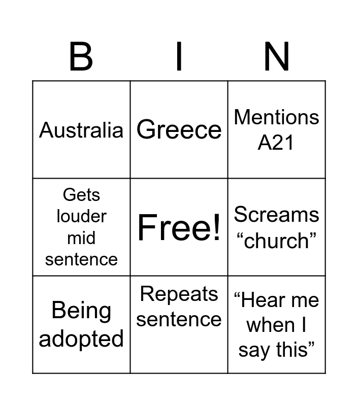 This bingo card has a free space and 8 words: Screams “church”, Mentions A21, Greece, Being adopted, Australia, “Hear me when I say this”, Gets louder mid sentence and Repeats sentence.