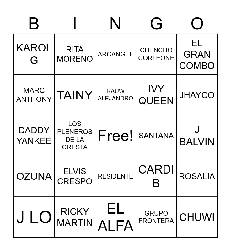 This bingo card has a free space and 24 words: ELVIS CRESPO, RICKY MARTIN, RAUW ALEJANDRO, J LO, EL GRAN COMBO, KAROL G, MARC ANTHONY, RITA MORENO, SANTANA, RESIDENTE, IVY QUEEN, DADDY YANKEE, CARDI B, ROSALIA, TAINY, GRUPO FRONTERA, J BALVIN, ARCANGEL, JHAYCO, LOS PLENEROS DE LA CRESTA, CHUWI, OZUNA, CHENCHO CORLEONE and EL ALFA.