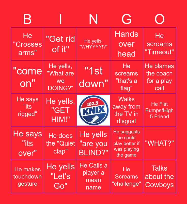 This bingo card has a free space and 29 words: He makes touchdown gesture, $&*@!%, He yells, "GET HIM!", He gets up and walks around., He "Crosses arms", He yells, "WHYYYY!?", He yells, "What are we DOING?", He does the "Quiet clap", Walks away from the TV in disgust, He yells "Let's Go", He Fist Bumps/High 5 Friend, Talks about the Cowboys, He Calls a player a mean name, He Screams "challenge", He blames the coach for a play call, He strings together multipe curse words in a row, He yells "are you BLIND?", He says "its over", He screams "Timeout", He says "its rigged", He suggests he could play better if was playing the game, Gets closer to the TV, He screams "that's a flag", "come on", Hands over head, "Get rid of it", "WHAT?", "1st down" and Says "you gotta catch that".