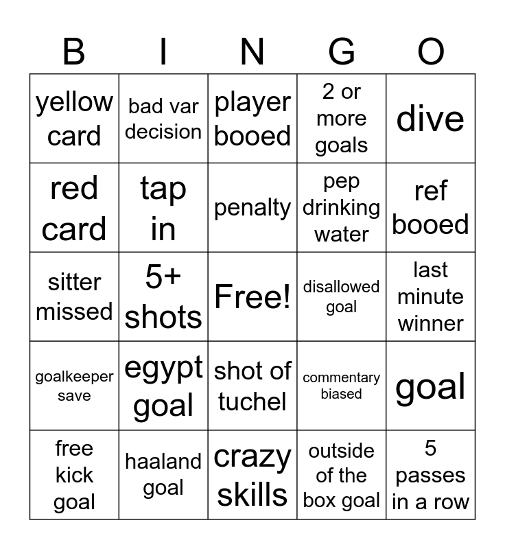 This bingo card has a free space and 24 words: egypt goal, haaland goal, penalty, free kick goal, dive, yellow card, red card, bad var decision, disallowed goal, shot of tuchel, pep drinking water, sitter missed, commentary biased, goal, tap in, outside of the box goal, last minute winner, player booed, ref booed, 5+ shots, 5 passes in a row, goalkeeper save, 2 or more goals and crazy skills.