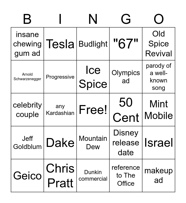 This bingo card has a free space and 106 words: streaming service, HORSES!, Old Spice Revival, What Would Jesus Do? PSA, 3 ads highlighting AI technology, company poking fun at themselves, QR code on screen, silent, serious ad, tearjerker, video game related commercial, Brooke Goff manages to secure a famous perosn for her ad, Snoop Dogg, Kevin Hart, Twitch Streamer, Key or Peele, Dwayne "The Rock" Johnson, Budlight, Turning Point USA, Matt Damon, kids havaing grown-up responsibilities, Mountain Dew, Ozempic (or other weight loss drug), musical artist popular before 2000 appears, movie trailer for an unncessary sequel, Temu, Dake, parody of a well-known song, "67", military propaganda, celebrity from a 90s sitcom, Disney release date, reference to The Office, Saudi Arabia tourism ad, Pepsi, suspiciously great song choice, mobile carrier, AI slop, 3 unique sports betting companies, Ice Spice, talking or dancing animal, Expedition 33 appearance, KPOP Demon Hunters, explosions, Jeff Goldblum, Mariah Carey, Arnold Schwarzenegger, musical number, insane chewing gum ad, Druski, makeup ad, Travis or Jason Kelce, Chris Pratt, Stranger Things reference, a Boy and his Dog, company tries to invent new word or trend, corporate/office setting, car ad, Marvel movie release date, playing yard football, Tesla, Sabrina Carpenter, takes place at a bar, Megan Thee Stallion, Gavin Newsome, old people being sillyyy, ad making fun of AI, logo isn't revealed until last second, Heated Rivalry reference, Olympics ad, celebrity couple, any Kardashian, Dunkin commercial, either Darnold or Maye, Lebron, Eminem, GTA 6, John Travolta, Tom Cruise, Will Smith, Johnny Depp, Macaulay Culkin, Shaquille O'Neal, Jason Mamoa, Benson Boone, Zohran Mamdani, Timothee Chalamet, 50 Cent, Sydney Sweeney, Cardi B, massive mascot change, Trump, Stephen Curry, Tom Brady, Pete Davidson, Crypto, Israel, T-Mobile, Verizon, AT&T, Mint Mobile, Progressive, State Farm, Progressive, Liberty Mutual, Geico and Allstate.