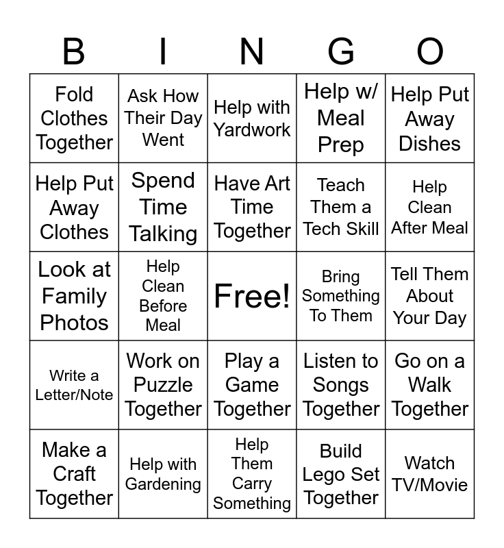 This bingo card has a free space and 24 words: Work on Puzzle Together, Help with Gardening, Have Art Time Together, Make a Craft Together, Help Put Away Dishes, Fold Clothes Together, Help Put Away Clothes, Ask How Their Day Went, Bring Something To Them, Play a Game Together, Teach Them a Tech Skill, Look at Family Photos, Listen to Songs Together, Go on a Walk Together, Spend Time Talking, Build Lego Set Together, Tell Them About Your Day, Help with Yardwork, Help Clean After Meal, Help Clean Before Meal, Watch TV/Movie, Write a Letter/Note, Help w/ Meal Prep and Help Them Carry Something.