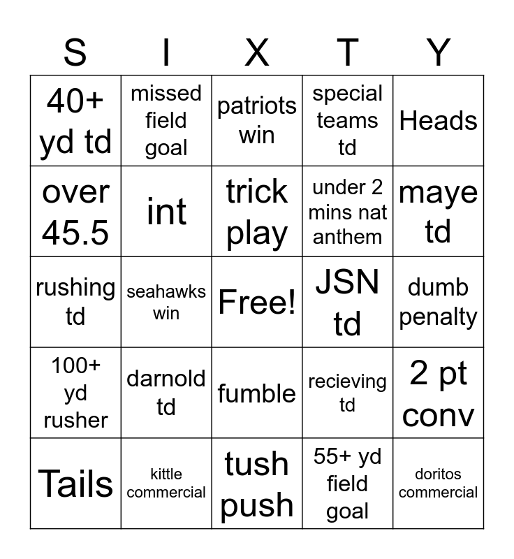 This bingo card has a free space and 29 words: Tails, over 2 mins nat anthem, seahawks win, drone shot of Santa Clara, 40+ yd td, patriots win, int, darnold td, JSN td, kittle commercial, dumb penalty, doritos commercial, tush push, 55+ yd field goal, maye td, under 45.5, fumble, 100+ yd rusher, Heads, rushing td, recieving td, coors commercial, under 2 mins nat anthem, over 45.5, special teams td, missed field goal, 2 pt conv, trick play and ot.