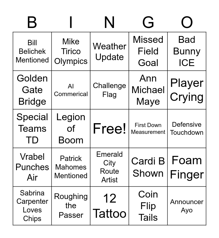 This bingo card has a free space and 24 words: Patrick Mahomes Mentioned, Roughing the Passer, Challenge Flag, Sabrina Carpenter Loves Chips, Bad Bunny ICE, Bill Belichek Mentioned, Golden Gate Bridge, Mike Tirico Olympics, First Down Measurement, Emerald City Route Artist, Ann Michael Maye, Special Teams TD, Cardi B Shown, Foam Finger, AI Commerical, Coin Flip Tails, Defensive Touchdown, Weather Update, Player Crying, Legion of Boom, Announcer Ayo, Vrabel Punches Air, Missed Field Goal and 12 Tattoo.