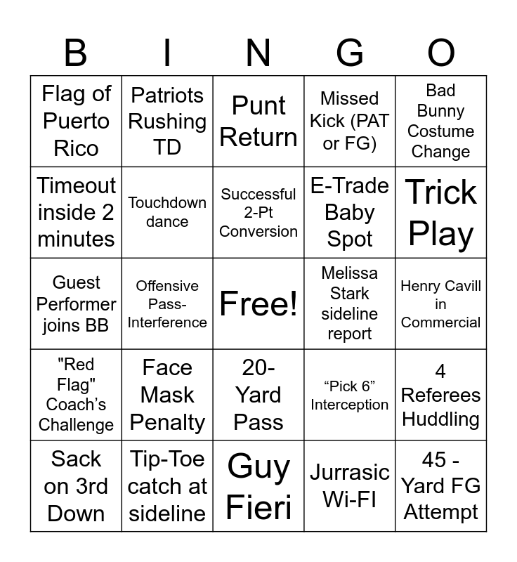 This bingo card has a free space and 68 words: Mountain Dew & Doritos, 45 -Yard FG Attempt, Seattle Field Goal Made, Drone “Lights” Formation, Turnover on Fumble, Seattle Passing TD, Patriots Rushing TD, 20+ Yard Pass TD, Successful 2-Pt Conversion, Gambling Commercial, 20-Yard Pass, 40-Yard Pass, Henry Cavill in Commercial, Bad Bunny Costume Change, Joe Montana on camera, Timeout inside 2 minutes, Offensive Pass-Interference, Flag of Puerto Rico, QB Yells “White 80”, Face Mask Penalty, E-Trade Baby Spot, “Pick 6” Interception, "Red Flag" Coach’s Challenge, Chain Gang Measurement, 25 Total Game Points, 15-yard QB rush, Celebrity Spotted In Crowd, Jake from State Farm, 4 Referees Huddling, Punt Fair Catch, Punt Return, Ball Spin on Field, 30 Total Game Points, Extra Point Made, Missed Kick (PAT or FG), “Tush Push” attempt, Puppy in Commercial, Sack on 3rd Down, Trick Play, Guest Performer joins BB, Pepsi Polar Bear!!, Clydesdale with “Wings”, Touchdown dance, Peyton Manning in Commercial, Aerial Shot of Stadium, Helmet pops off player, First team to 10 points, Both teams 7 point or more, Melissa Stark sideline report, Tip-Toe catch at sideline, Sofia Vergara sport Sketchers, Oakley Meta AI Glasses, T-Mobile “Tell Me Why”, Guy Fieri, Robot Dance-Off, Dancing in the Rain, Jurrasic Wi-FI, Mr. Beast, Kupp 15 Yard Catch, Patriots D Interception, Seattle D Interception, Player Throws Helmet, Kickoff Return 10+ Yards, Seattle “3 and Out”, Patriots “3 and Out”, Shirtless Fan in Stands, Catch by Tight End and 3rd Down and 15 (or more).