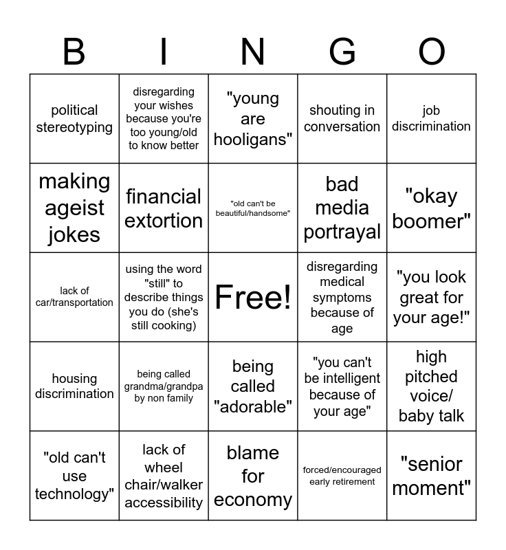 This bingo card has a free space and 24 words: being called grandma/grandpa by non family, lack of wheel chair/walker accessibility, "old can't be beautiful/handsome", "old can't use technology", job discrimination, political stereotyping, making ageist jokes, disregarding your wishes because you're too young/old to know better, disregarding medical symptoms because of age, being called "adorable", bad media portrayal, lack of car/transportation, "you can't be intelligent because of your age", high pitched voice/ baby talk, financial extortion, forced/encouraged early retirement, "you look great for your age!", "young are hooligans", "okay boomer", using the word "still" to describe things you do (she's still cooking), "senior moment", housing discrimination, shouting in conversation and blame for economy.