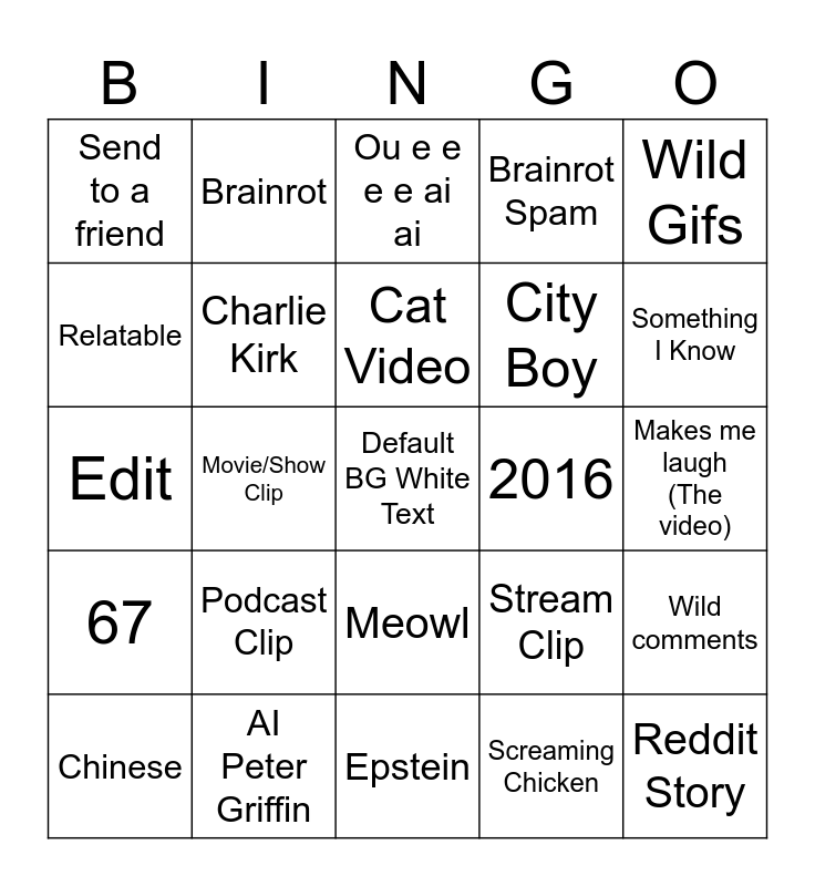 This bingo card has a free space and 24 words: Podcast Clip, AI Peter Griffin, Cat Video, Chinese, Wild Gifs, Send to a friend, Relatable, Brainrot, 2016, Meowl, City Boy, Edit, Stream Clip, Wild comments, Charlie Kirk, Screaming Chicken, Makes me laugh (The video), Ou e e e e ai ai, Something I Know, Movie/Show Clip, Reddit Story, 67, Brainrot Spam and Epstein.