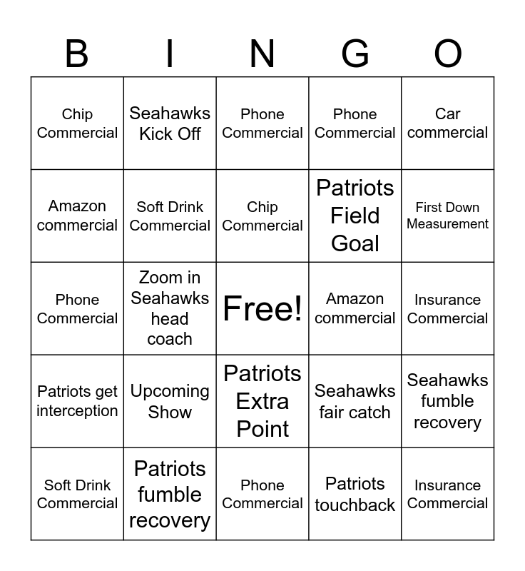 This bingo card has a free space and 78 words: First Down Measurement, Car commercial, Phone Commercial, Chip Commercial, Soft Drink Commercial, Amazon commercial, Beer Commercial, Upcoming Show, Upcoming Movie, Insurance Commercial, First Down Measurement, Car commercial, Phone Commercial, Chip Commercial, Soft Drink Commercial, Amazon commercial, Beer Commercial, Upcoming Show, Upcoming Movie, Insurance Commercial, First Down Measurement, Car commercial, Phone Commercial, Chip Commercial, Soft Drink Commercial, Amazon commercial, Beer Commercial, Upcoming Show, Upcoming Movie, Insurance Commercial, First Down Measurement, Car commercial, Phone Commercial, Chip Commercial, Soft Drink Commercial, Amazon commercial, Beer Commercial, Upcoming Show, Upcoming Movie, Insurance Commercial, Seahawks Extra Point, Seahawks Field Goal, Penalty on Seahawks, First down made by Seahawks, Seahawks Punt, Seahawks Kick Off, Seahawks get a sack, Seahawks rushing touchdown, Seahawks receiving touchdown, Seahawks get interception, Seahawks fumble recovery, Zoom in Seahawks head coach, Seahawks fair catch, Seahawks go for it on 4th down, Seahawks coach's challenge, Seahawks touchback, Seahawks injured player, Seahawks Missed field goal, Seahawks Timeout, Patriots Extra Point, Patriots Field Goal, Penalty on Patriots, First down made by Patriots, Patriots Punt, Patriots Kick Off, Patriots get a sack, Patriots rushing touchdown, Patriots receiving touchdown, Patriots get interception, Patriots fumble recovery, Zoom in Patriots head coach, Patriots fair catch, Patriots go for it on 4th down, Patriots coach's challenge, Patriots touchback, Patriots injured player, Patriots Missed field goal and Patriots Timeout.