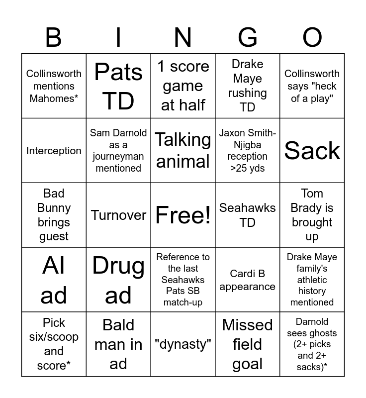 This bingo card has a free space and 24 words: Drug ad, Bald man in ad, Talking animal, Pick six/scoop and score*, Collinsworth says "heck of a play", Collinsworth mentions Mahomes*, Interception, Pats TD, Seahawks TD, Reference to the last Seahawks Pats SB match-up, Jaxon Smith-Njigba reception >25 yds, Bad Bunny brings guest, Cardi B appearance, Drake Maye family's athletic history mentioned, Sam Darnold as a journeyman mentioned, Missed field goal, Tom Brady is brought up, 1 score game at half, Sack, Turnover, Darnold sees ghosts (2+ picks and 2+ sacks)*, AI ad, Drake Maye rushing TD and "dynasty".