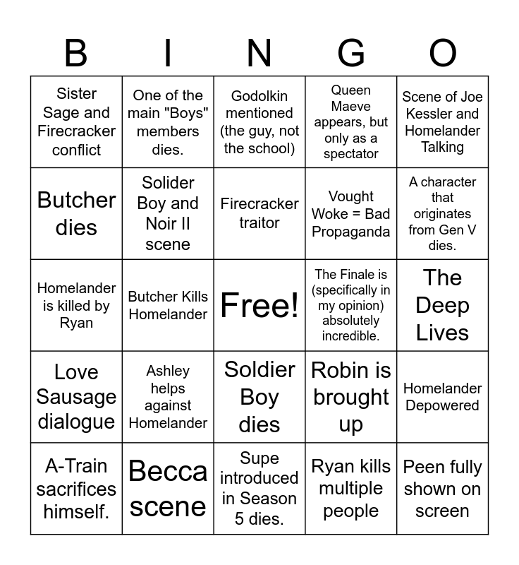 This bingo card has a free space and 24 words: Ashley helps against Homelander, Becca scene, Firecracker traitor, A-Train sacrifices himself., Scene of Joe Kessler and Homelander Talking, Sister Sage and Firecracker conflict, Butcher dies, One of the main "Boys" members dies., The Finale is (specifically in my opinion) absolutely incredible., Soldier Boy dies, Vought Woke = Bad Propaganda, Homelander is killed by Ryan, Robin is brought up, Homelander Depowered, Solider Boy and Noir II scene, Ryan kills multiple people, The Deep Lives, Godolkin mentioned (the guy, not the school), A character that originates from Gen V dies., Butcher Kills Homelander, Peen fully shown on screen, Love Sausage dialogue, Queen Maeve appears, but only as a spectator and Supe introduced in Season 5 dies..