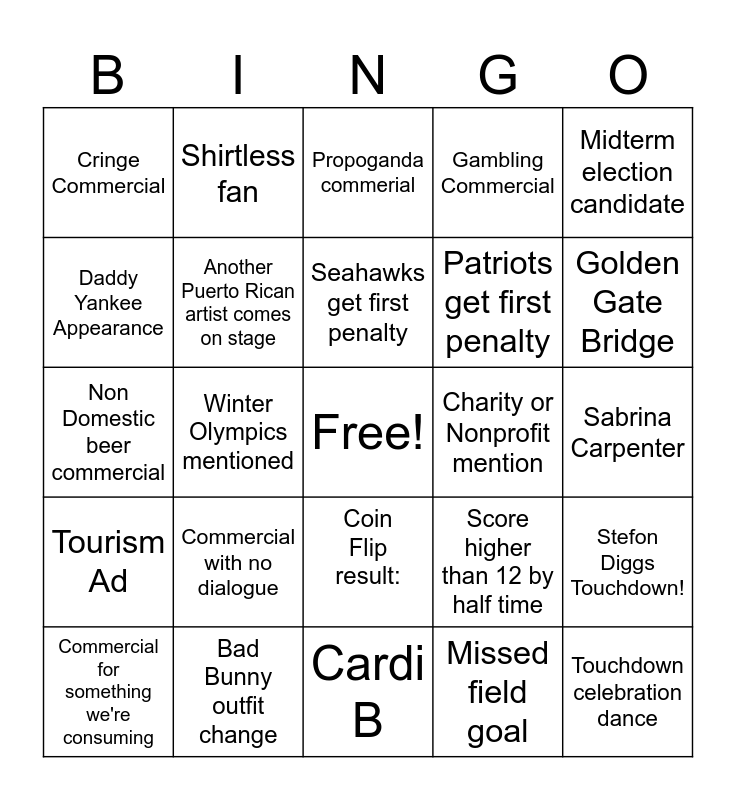 This bingo card has a free space and 24 words: Commercial with no dialogue, Bad Bunny outfit change, Seahawks get first penalty, Commercial for something we're consuming, Midterm election candidate, Cringe Commercial, Daddy Yankee Appearance, Shirtless fan, Charity or Nonprofit mention, Coin Flip result:, Patriots get first penalty, Non Domestic beer commercial, Score higher than 12 by half time, Stefon Diggs Touchdown!, Another Puerto Rican artist comes on stage, Missed field goal, Sabrina Carpenter, Propoganda commerial, Golden Gate Bridge, Winter Olympics mentioned, Touchdown celebration dance, Tourism Ad, Gambling Commercial and Cardi B.