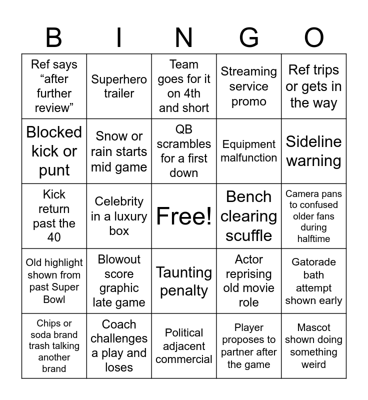 This bingo card has a free space and 155 words: Touchdown, Field goal, Missed field goal, Interception, Fumble, Sack, 3-and-out, 4th down attempt, 2-point conversion attempt, Successful 2-point conversion, Red zone turnover, Pick-six, Kick return past the 40, Punt inside the 10, Blocked kick or punt, QB scrambles for a first down, Trick play, Flea flicker, Screen pass goes for big yards, Defensive injury timeout, Announcer says “legacy”, Announcer says “GOAT”, “He grew up dreaming of this moment”, Shot of player’s family in the stands, Crying fan, Shirtless fan, Celebrity in a luxury box, Ref explains penalty on mic, Bad call controversy, Rules analyst appears, Hot mic moment, Awkward announcer joke, Mention of a player’s college, Graphic comparing QBs, Slow motion replay montage, Coach yelling on sideline, Coach looking clueless, Player arguing with ref, Gatorade bath attempt shown early, Beer commercial, Car commercial, Insurance commercial, Phone company commercial, Fast food commercial, Celebrity cameo in a commercial, Actor reprising old movie role, Nostalgia bait commercial, Super emotional commercial, Funny animal commercial, Talking baby or animal, AI themed commercial, Crypto or finance ad, Movie trailer, Superhero trailer, Horror movie trailer, Streaming service promo, Weight loss or pharma ad, Local regional commercial that feels low budget, Halftime show outfit change, Halftime show lip sync discourse online, Fireworks during halftime, Camera pans to confused older fans during halftime, Player cramps during drive, Equipment malfunction, Chain gang measurement, Clock management disaster, Team goes for it on 4th and short, Fake punt or fake field goal, Overturned call after review, Ref says “after further review”, Game goes to overtime, Winning score in final 2 minutes, Blowout score graphic late game, Player proposes to partner after the game, Confetti cannons go off, Lombardi Trophy shown before game ends, Owner shown celebrating awkwardly, Owner looks like they don’t know what’s happening, GM in the booth looking stressed, Sideline reporter gets ignored, Coach gives cliché interview answer, “We just gotta execute” interview quote, Player says “Nobody believed in us”, Victory formation kneel, Timeout called right before snap to ice kicker, Kicker misses after being iced, Player loses helmet mid play, Player’s chain or mouthguard falls out, Unsportsmanlike conduct penalty, Taunting penalty, Sideline warning, Bench clearing scuffle, Linemen pushing after whistle, Player flips into end zone, Ball hits the goalpost, Doink field goal, Snow or rain starts mid game, Wind affects a kick, Stadium crowd shot doing the wave, Fans doing a coordinated chant, Opposing fans shown sitting in silence, Kid asleep in the stands, Fan in full body paint, Fan wearing a cheesehead or wild costume, Cutaway to famous former player, Old highlight shown from past Super Bowl, Announcer references betting odds, Announcer mentions fantasy football, On-screen stat that makes no sense, Next Gen Stats graphic, AWS or analytics graphic, Drone shot of the stadium, Blimp shot of the stadium, Sky cam swoops dramatically, Camera loses the ball mid play, Mic’d up player clip, Player swears and it gets bleeped, Coach headset slam, Coach challenges a play and loses, Ref trips or gets in the way, Ball boy or chain crew gets screen time, Mascot shown doing something weird, Mascot dancing with cheerleaders, Cheerleader drops pom pom, T-shirt cannon into crowd, Crowd fails to catch a giveaway, Guy double-fisting beers, Someone chugs on the jumbotron, Kiss cam moment, Kiss cam rejection, Proposal on kiss cam, Someone holding a “Taylor Swift” sign, Taylor Swift, Cutaway to celebrity girlfriend reaction, Social media screenshot shown on broadcast, Commercial that makes zero sense, Commercial that makes everyone go “what?”, Commercial sequel to last year’s ad, Brand tries to be “wholesome” and misses, Weird food mashup commercial, Chips or soda brand trash talking another brand, Political adjacent commercial, Military tribute segment, “Salute to service” moment, Flyover footage replayed, National anthem clip replay, Overly long standing ovation, Stadium light show at night, Phone flashlights in crowd, Announcer says “historic” about something minor, Someone tweets “scripted”, Someone complains about refs being rigged, Group chat arguing about commercials, Someone falls asleep before halftime and Someone says “I’m just here for commercials”.