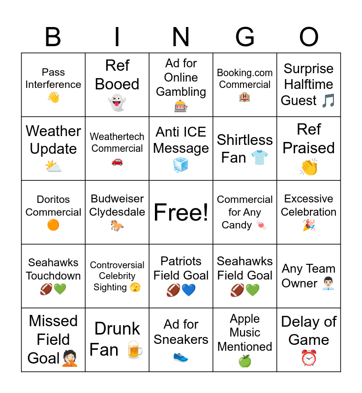 This bingo card has a free space and 33 words: New TV Show Announced πΊ, Anticipated Movie Trailerπ¬, Budweiser Clydesdale π, Avocados from Mexico π₯, Seahawks Touchdown ππ, Weathertech Commercial π, Surprise Halftime Guest π΅, Missed Field Goalπ€¦π», Ref Booed π», Patriots Touchdown ππ, Anti ICE Message π§, Ad for Online Gambling π°, Wholesome Celebrity Sighting π, Emotional Ad π, Commercial for Any Candy π¬, Ref Praised π, Drunk Fan πΊ, Doritos Commercial π , Controversial Celebrity Sighting π«£, Seahawks Field Goal ππ, Patriots Field Goal ππ, Interception β, Pass Interference π, Excessive Celebration π, Ad for Sneakers π, Delay of Game β°, Booking.com Commercial π¨, Shirtless Fan π, Weather Update β , Any Team Owner π¨π»βπΌ, Overhead Stadium Shot πΉ, Apple Music Mentioned π and Any Fast Food Commercial π.