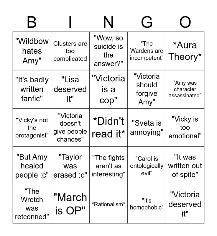 This bingo card has a free space and 24 words: "Taylor was erased :c", "March is OP", "Victoria is a cop", "The Wretch was retconned", *Aura Theory*, "Wildbow hates Amy", "It's badly written fanfic", Clusters are too complicated, "Sveta is annoying", "The fights aren't as interesting", "Victoria should forgive Amy", "Vicky's not the protagonist", "Carol is ontologically evil", "It was written out of spite", "Lisa deserved it", "It's homophobic", "Vicky is too emotional", "Wow, so suicide is the answer?", "Amy was character assassinated", "Victoria doesn't give people chances", "Victoria deserved it", "But Amy healed people :c", "The Wardens are incompetent" and *Rationalism*.