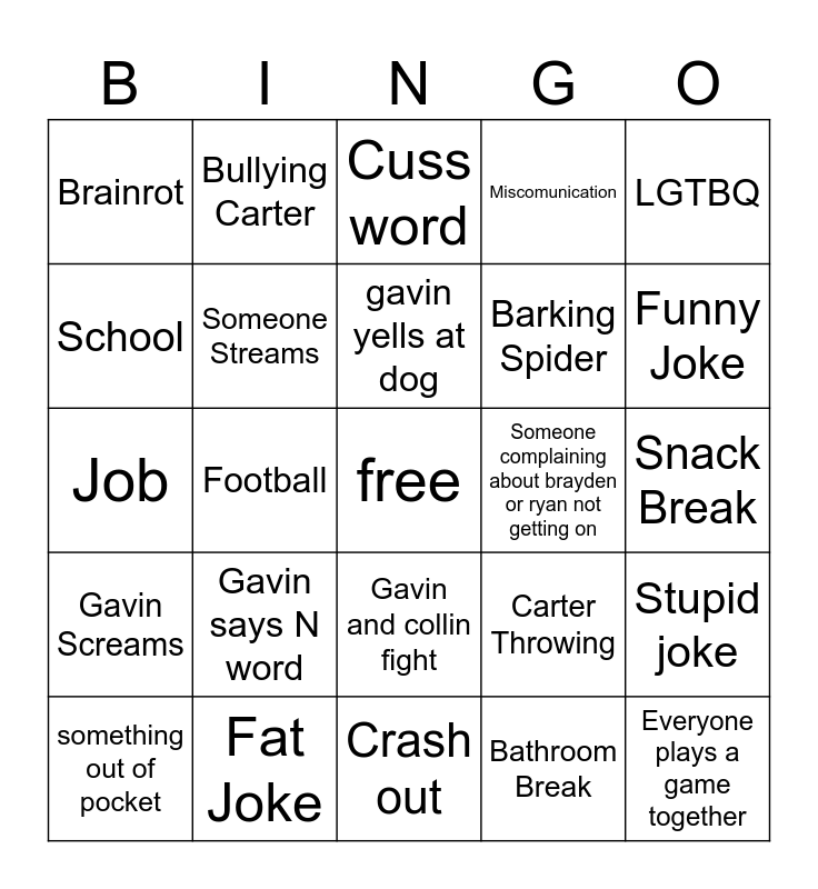 This bingo card has a free space and 24 words: Gavin says N word, Fat Joke, gavin yells at dog, something out of pocket, LGTBQ, Brainrot, School, Bullying Carter, Someone complaining about brayden or ryan not getting on, Gavin and collin fight, Barking Spider, Job, Carter Throwing, Stupid joke, Someone Streams, Bathroom Break, Snack Break, Cuss word, Funny Joke, Football, Everyone plays a game together, Gavin Screams, Miscomunication and Crash out.