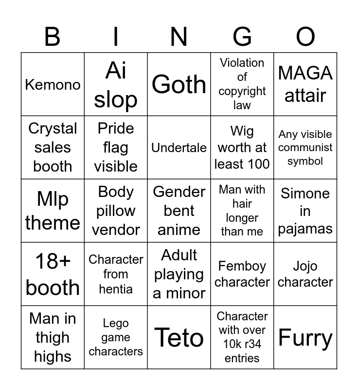 This bingo card has a free space and 24 words: Man in thigh highs, Character from hentia, Undertale, Character with over 10k r34 entries, MAGA attair, Kemono, Ai slop, Goth, Man with hair longer than me, Simone in pajamas, Mlp theme, Pride flag visible, Femboy character, Jojo character, Crystal sales booth, Lego game characters, Teto, Violation of copyright law, Any visible communist symbol, 18+ booth, Body pillow vendor, Adult playing a minor, Wig worth at least 100 and Furry.