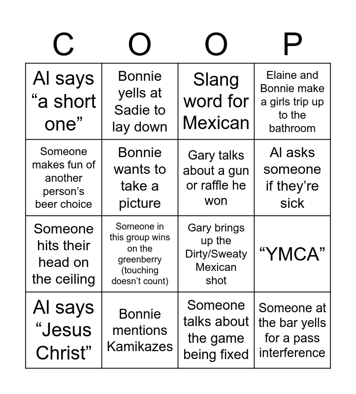 This bingo card has 16 words: Bonnie mentions Kamikazes, “YMCA”, Slang word for Mexican, Al says “a short one”, Someone hits their head on the ceiling, Bonnie yells at Sadie to lay down, Gary brings up the Dirty/Sweaty Mexican shot, Someone talks about the game being fixed, Someone makes fun of another person’s beer choice, Bonnie wants to take a picture, Al says “Jesus Christ”, Elaine and Bonnie make a girls trip up to the bathroom, Someone in this group wins on the greenberry (touching doesn’t count), Al asks someone if they’re sick, Gary talks about a gun or raffle he won and Someone at the bar yells for a pass interference.