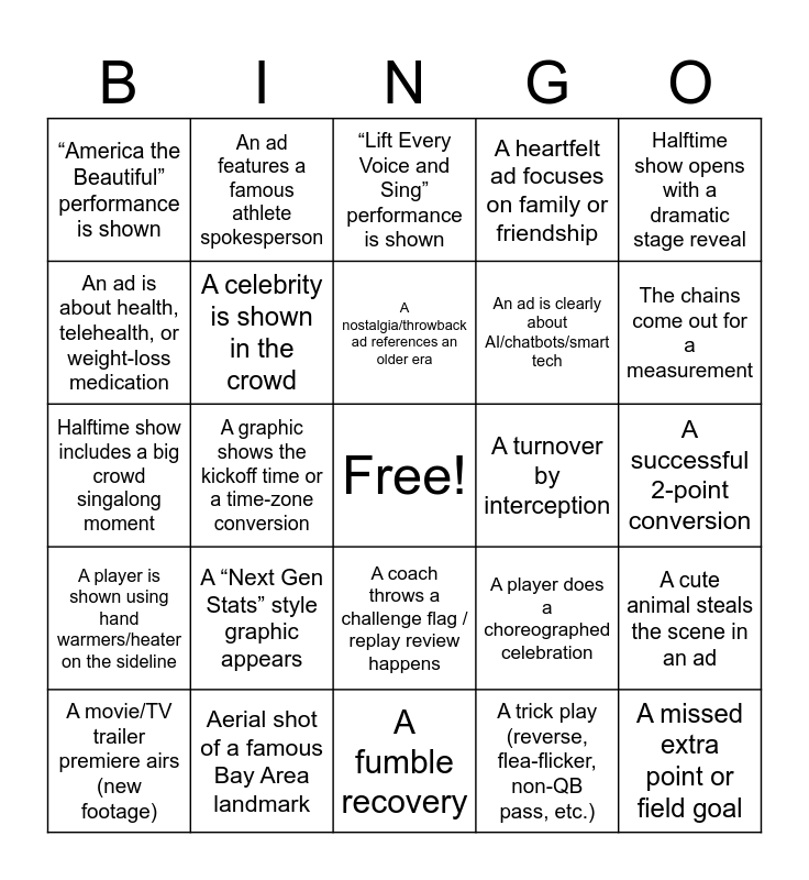 This bingo card has a free space and 30 words: Aerial shot of a famous Bay Area landmark, Announcers mention the host stadium/city, A graphic shows the kickoff time or a time-zone conversion, National anthem performance gets a big reaction shot, “America the Beautiful” performance is shown, “Lift Every Voice and Sing” performance is shown, A celebrity is shown in the crowd, A coach throws a challenge flag / replay review happens, A turnover by interception, A fumble recovery, A successful 2-point conversion, A missed extra point or field goal, A trick play (reverse, flea-flicker, non-QB pass, etc.), A sideline tablet/coach-headset moment becomes a meme, The chains come out for a measurement, A penalty is announced “after discussion”, A player does a choreographed celebration, A player is shown using hand warmers/heater on the sideline, A “Next Gen Stats” style graphic appears, Halftime show opens with a dramatic stage reveal, Halftime show includes a big crowd singalong moment, An ad features a recognizable A-list celebrity cameo, An ad features a famous athlete spokesperson, An ad is clearly about AI/chatbots/smart tech, An ad is about health, telehealth, or weight-loss medication, A heartfelt ad focuses on family or friendship, A cute animal steals the scene in an ad, A movie/TV trailer premiere airs (new footage), A nostalgia/throwback ad references an older era and A QR code, hashtag, or short link appears on screen.