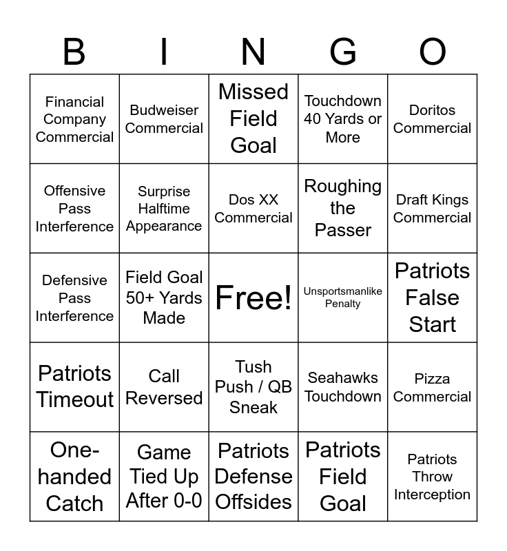 This bingo card has a free space and 44 words: Seahawks Timeout, Patriots Throw Interception, Seahawks False Start, One-handed Catch, Non-athlete celebrity crowd shot, Patriots Field Goal, Missed Field Goal, 4th Down Conversion Successful, Doritos Commercial, Game Tied Up After 0-0, Touchdown 40 Yards or More, Unsportsmanlike Penalty, Tush Push / QB Sneak, Call Reversed, Patriots Touchdown, Patriots Defense Offsides, Defense Recovers a Fumble, Defensive Pass Interference, Golden Gate Bridge Shown, Draft Kings Commercial, Budweiser Commercial, Coke Commercial, Loss of 8+ Yards, Financial Company Commercial, Kick Return Touchdown, Patriots False Start, Seahawks Field Goal, 4th Down Conversion Failed, Seahawks Touchdown, Patriots Timeout, Pepsi Commercial, Pizza Commercial, Toyota Commercial, Ford Commercial, Field Goal 50+ Yards Made, QB TD Run, Seahawks Throw Interception, World's Windiest Road, Dos XX Commercial, Offensive Pass Interference, Roughing the Passer, Trick Play, Surprise Halftime Appearance and 20+ Yard Run.