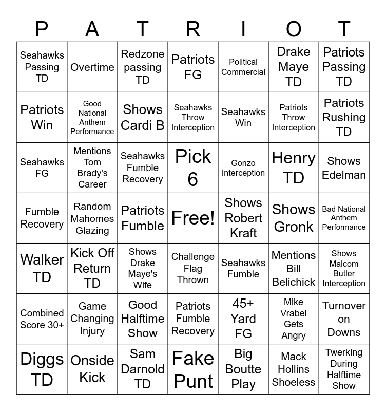 This bingo card has a free space and 54 words: Fake Punt, Mentions Tom Brady's Career, Seahawks Rushing TD, Shows Robert Kraft, Pick 6, Combined Score 30+, Patriots FG, Bad Halftime Show, Drake Maye TD, Game Changing Injury, Seahawks Passing TD, Mentions Bill Belichick, Fumble Recovery, Shows Edelman, Turnover on Downs, Random Mahomes Glazing, Patriots Throw Interception, Good National Anthem Performance, Big Boutte Play, Seahawks FG, Gonzo Interception, Shows Gronk, Patriots Rushing TD, Political Commercial, Mack Hollins Shoeless, Overtime, Shows Drake Maye's Wife, JSN TD, Bad National Anthem Performance, Patriots Fumble, 3 TDs Before Half, Seahawks Fumble, Mike Vrabel Gets Angry, Diggs TD, Redzone passing TD, Shows Malcom Butler Interception, Seahawks Throw Interception, Henry TD, Twerking During Halftime Show, Patriots Passing TD, Good Halftime Show, Patriots Fumble Recovery, 45+ Yard FG, Mentions previous Pats vs Seahawks SB, Seahawks Fumble Recovery, Onside Kick, Challenge Flag Thrown, Walker TD, Patriots Win, Seahawks Win, Shows Cardi B, Sam Darnold TD, Kick Off Return TD and Controversial Flag.