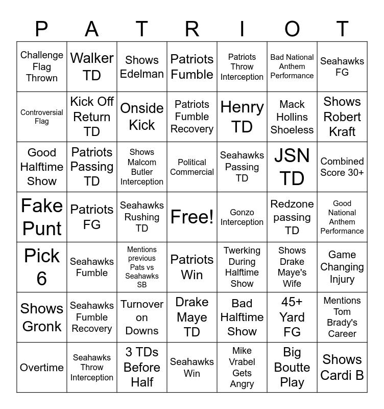This bingo card has a free space and 54 words: Seahawks Win, Patriots Passing TD, Random Mahomes Glazing, Gonzo Interception, Political Commercial, Shows Gronk, Patriots Fumble, Diggs TD, Bad National Anthem Performance, Seahawks Fumble Recovery, Challenge Flag Thrown, Shows Drake Maye's Wife, Fake Punt, Combined Score 30+, Mentions Tom Brady's Career, Patriots FG, Mack Hollins Shoeless, Kick Off Return TD, Mike Vrabel Gets Angry, Good Halftime Show, Seahawks Passing TD, Redzone passing TD, Shows Robert Kraft, Patriots Throw Interception, Big Boutte Play, Walker TD, Mentions previous Pats vs Seahawks SB, Fumble Recovery, Good National Anthem Performance, Seahawks Rushing TD, Patriots Rushing TD, Twerking During Halftime Show, 45+ Yard FG, Overtime, Shows Edelman, Game Changing Injury, Patriots Fumble Recovery, JSN TD, Shows Cardi B, Seahawks FG, Turnover on Downs, Drake Maye TD, Bad Halftime Show, Sam Darnold TD, Shows Malcom Butler Interception, Seahawks Throw Interception, Patriots Win, Pick 6, Controversial Flag, Henry TD, Onside Kick, 3 TDs Before Half, Seahawks Fumble and Shows Bill Belichick.
