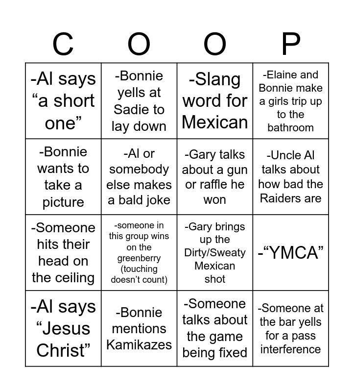 This bingo card has 16 words: -Bonnie mentions Kamikazes, -“YMCA”, -Slang word for Mexican, -Al says “a short one”, -Someone hits their head on the ceiling, -Bonnie yells at Sadie to lay down, -Gary brings up the Dirty/Sweaty Mexican shot, -Someone talks about the game being fixed, -Bonnie wants to take a picture, -Al or somebody else makes a bald joke, -Al says “Jesus Christ”, -Elaine and Bonnie make a girls trip up to the bathroom, -someone in this group wins on the greenberry (touching doesn’t count), -Uncle Al talks about how bad the Raiders are, -Gary talks about a gun or raffle he won and -Someone at the bar yells for a pass interference.
