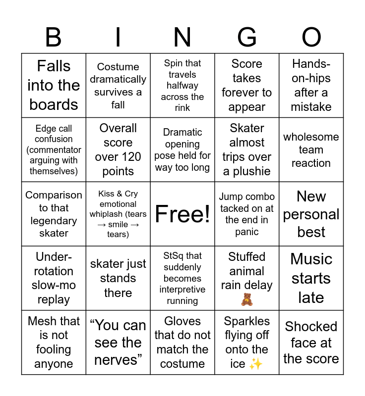 This bingo card has a free space and 37 words: Someone falls 3 times in a program, a quad jump is landed, Amber Glenn lands her triple axel, Overall score over 120 points, Music starts late, skater just stands there, Dramatic opening pose held for way too long, Popped jump into a sad single, Hands-on-hips after a mistake, Coach clapping aggressively at the boards, Kiss & Cry emotional whiplash (tears → smile → tears), Score takes forever to appear, Shocked face at the score, New personal best, Edge call confusion (commentator arguing with themselves), Under-rotation slow-mo replay, Level 4 spin flex 💪, Spin that travels halfway across the rink, StSq that suddenly becomes interpretive running, Jump combo tacked on at the end in panic, Falls into the boards, wholesome team reaction, Mesh that is not fooling anyone, Gloves that do not match the costume, Straps you’re worried about, Sparkles flying off onto the ice ✨, Costume dramatically survives a fall, she is barbie and he is just ken, Johnny Weir says something rude, “They’ve been working on consistency”, “This program really shows their maturity”, “You can see the nerves”, Comparison to that legendary skater, Commentator apologizes for being harsh, Stuffed animal rain delay 🧸, Skater almost trips over a plushie and Camera zooms in at the worst possible moment.