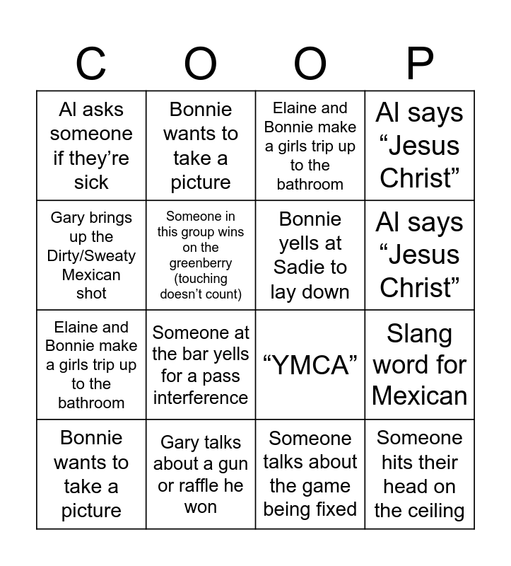 ⚠ This card has duplicate items: Bonnie mentions Kamikazes (2), “YMCA” (2), Slang word for Mexican (2), Al says “a short one” (2), Someone hits their head on the ceiling (2), Bonnie yells at Sadie to lay down (2), Someone talks about the game being fixed (2), Bonnie wants to take a picture (2), Al says “Jesus Christ” (2), Elaine and Bonnie make a girls trip up to the bathroom (2), Someone in this group wins on the greenberry (touching doesn’t count) (2), Uncle Al talks about how bad the Raiders are (2), Gary talks about a gun or raffle he won (2), Someone at the bar yells for a pass interference (2)