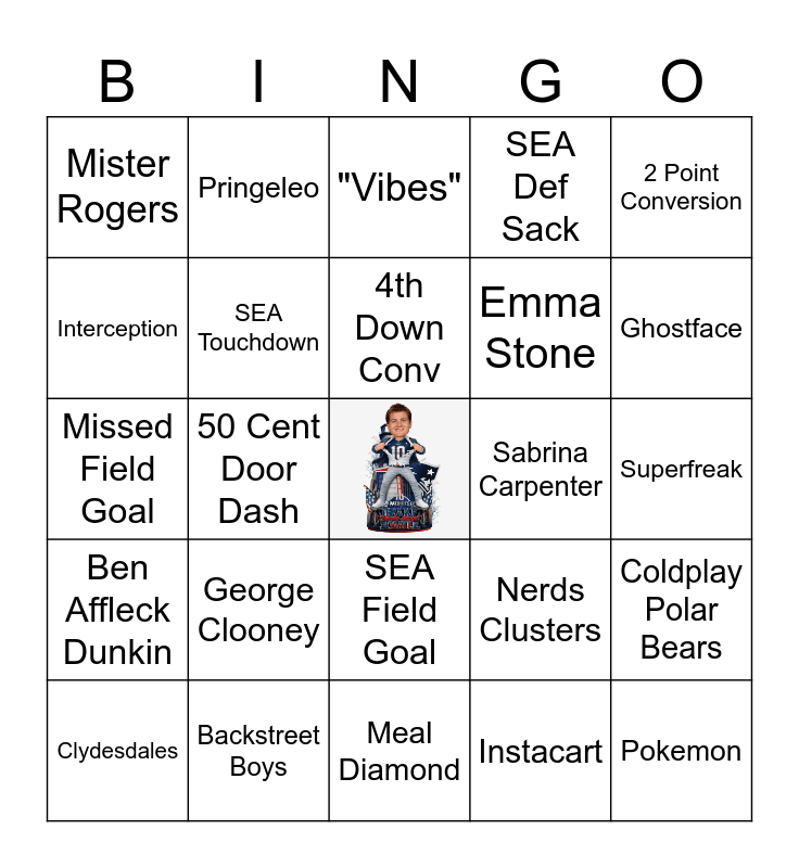 This bingo card has a free space and 35 words: PATS Touchdown, PATS Field Goal, PATS Def Sack, SEA Touchdown, SEA Field Goal, SEA Def Sack, Interception, Fumble, 4th Down Conv, 4th Down Fail, Missed Field Goal, 2 Point Conversion, Ann Michael Maye, Jurassic Park, Mister Rogers, Sabrina Carpenter, Instacart, 50 Cent Door Dash, Ben Affleck Dunkin, Pokemon, Nerds Clusters, Clydesdales, Coldplay Polar Bears, Backstreet Boys, "Vibes", Ghostface, "The Game is Ours", Serena Williams, Emma Stone, Superfreak, Hailee Steinfeld, Meal Diamond, George Clooney, Pringeleo and Ritz Island.