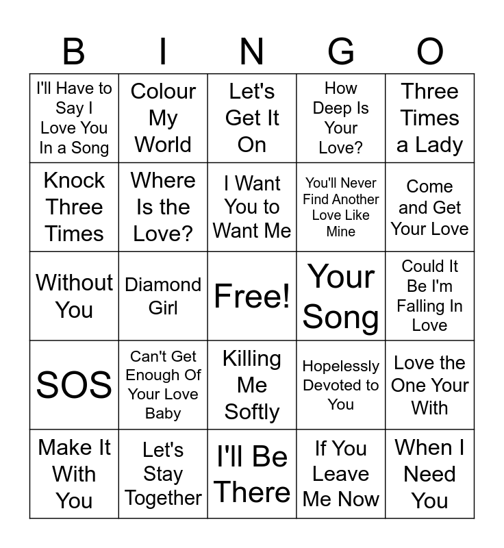 This bingo card has a free space and 43 words: Wonderful Tonight, When I Need You, Love Will Keep Us Together, Make It With You, Lovely Day, If You Leave Me Now, Let's Get It On, Just the Way You Are, Three Times a Lady, Let's Stay Together, How Deep Is Your Love?, Your Song, Killing Me Softly, Can't Get Enough Of Your Love Baby, Always On My Mind, I'll Be There, Annie's Song, Without You, My Love, Come and Get Your Love, Colour My World, You Make Loving Fun, Moondance, I'll Have to Say I Love You In a Song, December 1963, Oh What A Night, Could It Be I'm Falling In Love, Feel Like Makin' Love, Have You Seen Her?, Hopelessly Devoted to You, SOS, Me and Bobbie McGee, Love the One Your With, Let Your Love Flow, Diamond Girl, Still the One, Show Me the Way, Fooled Around and Fell In Love, I Want You to Want Me, Knock Three Times, You'll Never Find Another Love Like Mine, The Air That I Breath, Where Is the Love? and Beth.