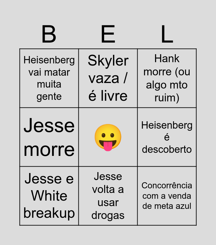 This bingo card has a free space and 8 words: Jesse morre, Skyler vaza / é livre, Heisenberg é descoberto, Jesse e White breakup, Hank morre (ou algo mto ruim), Heisenberg vai matar muita gente, Jesse volta a usar drogas and Concorrência com a venda de meta azul.