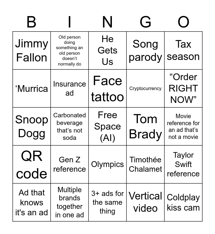 This bingo card has a free space and 28 words: Taylor Swift reference, Dancing animal, Cryptocurrency, Vertical video, ‘Murrica, He Gets Us, Old person doing something an old person doesn’t normally do, QR code, Tom Brady, Ad that knows it's an ad, Snoop Dogg, Song parody, Multiple brands together in one ad, 3+ ads for the same thing, “Order RIGHT NOW”, Blatant reference to on the 90’s, Gen Z reference, Insurance ad, Face tattoo, Olympics, Jimmy Fallon, 67, Coldplay kiss cam, Carbonated beverage that’s not soda, Movie reference for an ad that’s not a movie, Timothée Chalamet, Tax season and Betting/gambling.