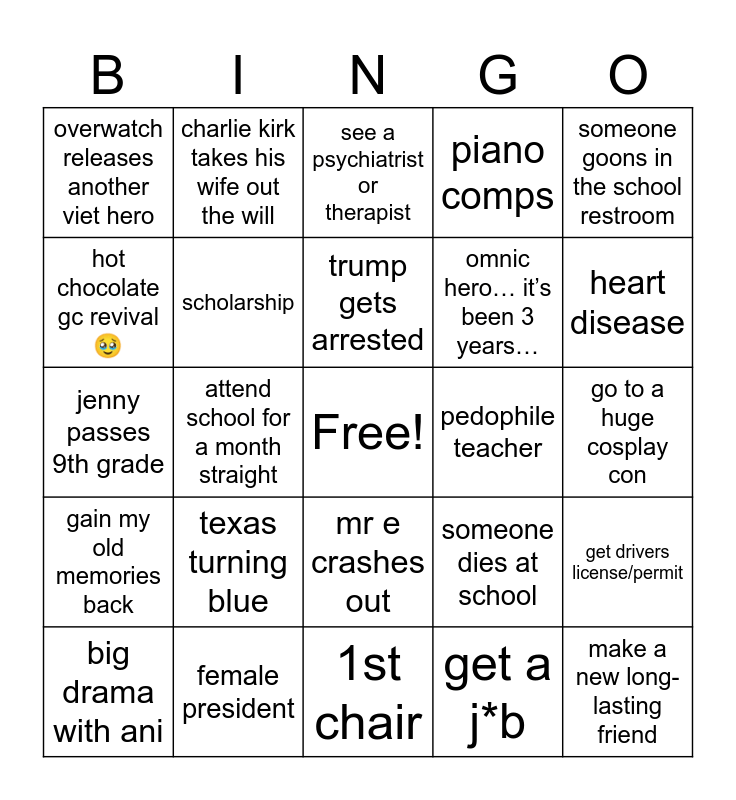 This bingo card has a free space and 24 words: texas turning blue, female president, trump gets arrested, big drama with ani, someone goons in the school restroom, overwatch releases another viet hero, hot chocolate gc revival 🥹, charlie kirk takes his wife out the will, pedophile teacher, mr e crashes out, omnic hero… it’s been 3 years…, jenny passes 9th grade, someone dies at school, get drivers license/permit, scholarship, get a j*b, go to a huge cosplay con, see a psychiatrist or therapist, heart disease, attend school for a month straight, make a new long-lasting friend, gain my old memories back, piano comps and 1st chair.