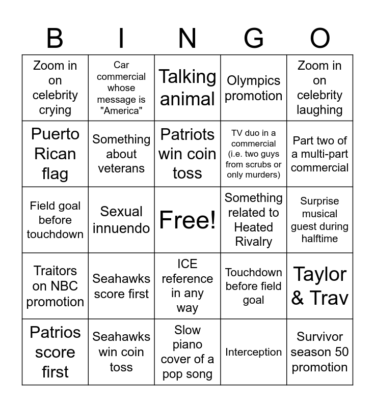 This bingo card has a free space and 24 words: Seahawks score first, Seahawks win coin toss, Patriots win coin toss, Patrios score first, Zoom in on celebrity laughing, Zoom in on celebrity crying, Puerto Rican flag, Car commercial whose message is "America", Something related to Heated Rivalry, ICE reference in any way, TV duo in a commercial (i.e. two guys from scrubs or only murders), Field goal before touchdown, Touchdown before field goal, Taylor & Trav, Something about veterans, Interception, Surprise musical guest during halftime, Talking animal, Part two of a multi-part commercial, Sexual innuendo, Survivor season 50 promotion, Traitors on NBC promotion, Olympics promotion and Slow piano cover of a pop song.