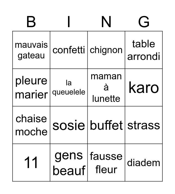 This bingo card has 16 words: gens beauf, strass, chignon, mauvais gateau, chaise moche, confetti, buffet, fausse fleur, pleure marier, la queuelele, 11, table arrondi, sosie, karo, maman à lunette and diadem.