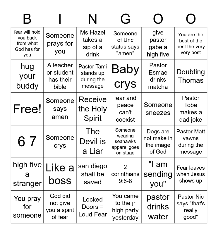 This bingo card has 36 words: 2 corinthians 9:6-8, san diego shall be saved, You came to the jr high party yesterday, hug your buddy, 6 7, fear and peace can't coexist, A teacher or student has their bible, Locked Doors = Loud Fear, give pastor gabe a high five, "I am sending you", Doubting Thomas, Someone of Unc status says "amen", Fear leaves when Jesus shows up, Someone says amen, Baby crys, fear will hold you back from what God has for you, high five a stranger, Someone sneezes, Free!, Ms Hazel takes a sip of a drink, Receive the Holy Spirit, Someone crys, Someone wearing seahawks apparel goes on stage, The Devil is a Liar, Dogs are not make in the image of God, Someone prays for you, Pastor Esmae drinks matcha, God did not give you a spirit of fear, Pastor Tami stands up during the message, You are the best of the best the very very best, Pastor Nic says "that's really good", You pray for someone, Pastor Matt yawns during the message, Pastor Tobe makes a dad joke, Like a boss and pastor drinks water.